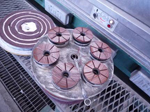 研磨の過程は、ダイヤモンドを貼り付けた砥石で仕上げるが、その目の粗さから400番(1平方センチの粒の数)から5000番まであり、数字が高いほど仕上げ面がより滑らかになる。石を石で磨くなんて不思議な印象を受けたが、地球上で一番硬く減りが少ないといわれるダイヤモンドを使うことに納得した。(写真C)