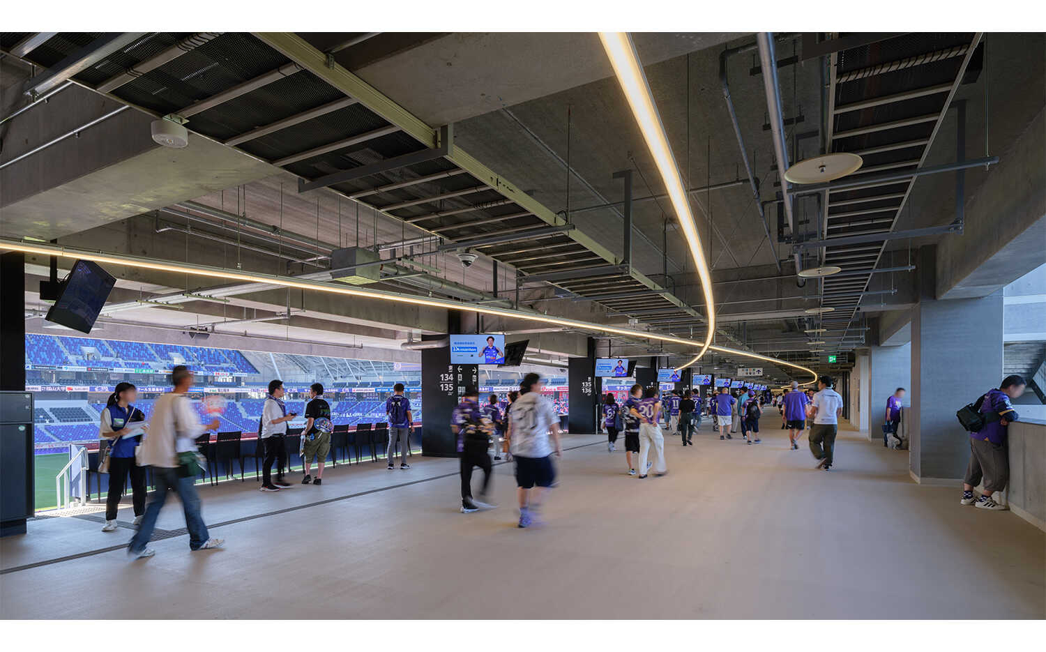 スタジアムは、国際スタジアム基準に合致した「南北方向」を前提とし、中央公園広場の西側に配置し、東側に芝生広場を配置する計画としました。スタジアム2階は、非試合時にも通行可能なパークコンコースを設けることによって、東側広場と西側本川河畔を繋ぐことで回遊性を高め、日常的に立ち寄れる回遊路となっています。またスタジアム3階は、幅10mのメインコンコースを設けることによって、試合時には周回が可能な観客のメイン動線となります。コンコースの2層化により利用者・市民の回遊性を高め、いつでもまちに開かれたスタジアムパークを実現しました。
