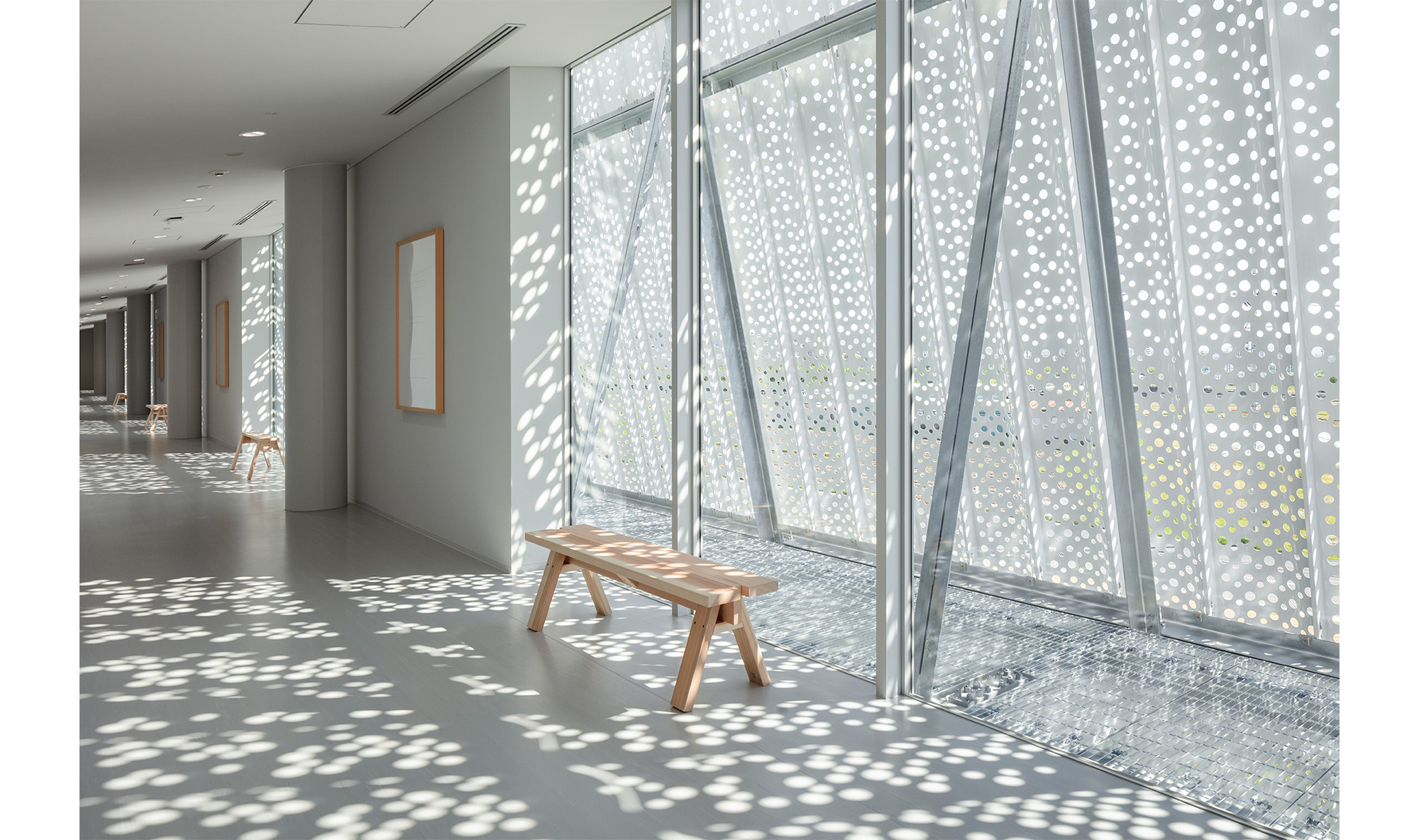 琵琶湖周辺で長く愛用されてきた葦簀(よしず)をモチーフに、強い陽射しを遮断しながら心地よく風を通す機能を持たせた「美」を象徴する環境装置「YOSHIZU SKIN」が木漏れ日空間を創出しています。