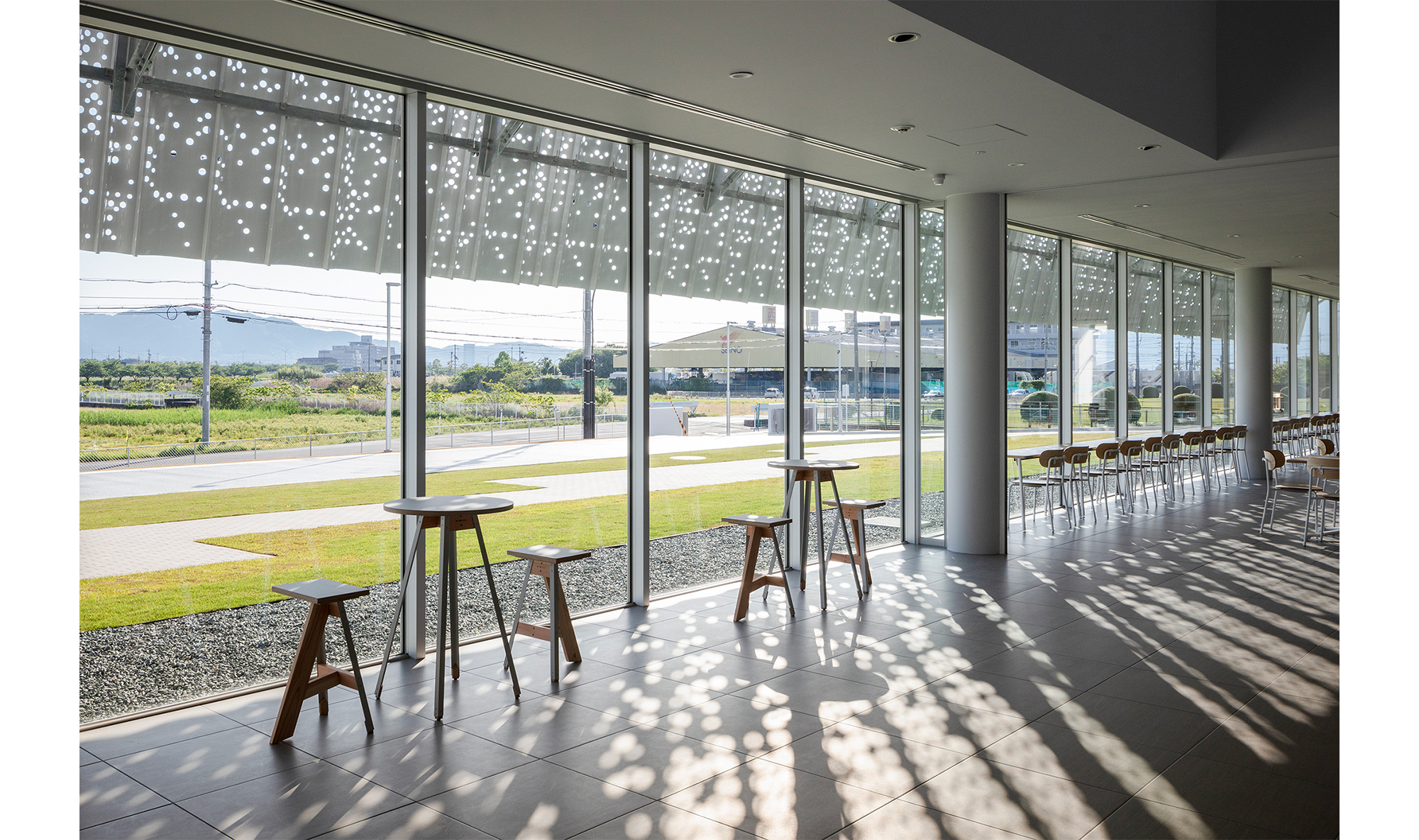 葦簀(よしず)をモチーフにした「YOSHIZU SKIN」は、強い陽射しを遮断しながら風を通し、心地のいい木漏れ日空間を創出しつつ、環境装置として機能し、建物全体として30%のエネルギー消費量の削減を実現しました。