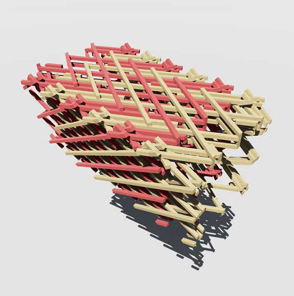 研究施設内の事務棟と実験棟をつなぐ、一般流通小径木材を二重螺旋状に組み上げた人道橋です。