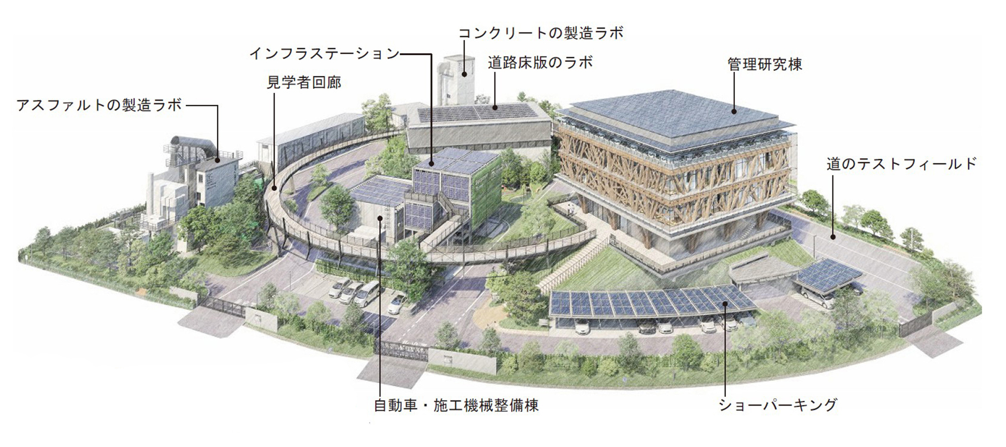 ゼロカーボンビルを目指した施設の核となる「管理研究棟」や設備中枢となる「インフラステーション」の他、脱炭素・資源循環に貢献する「アスファルトの製造ラボ」や「コンクリートの製造ラボ」が配置されます。