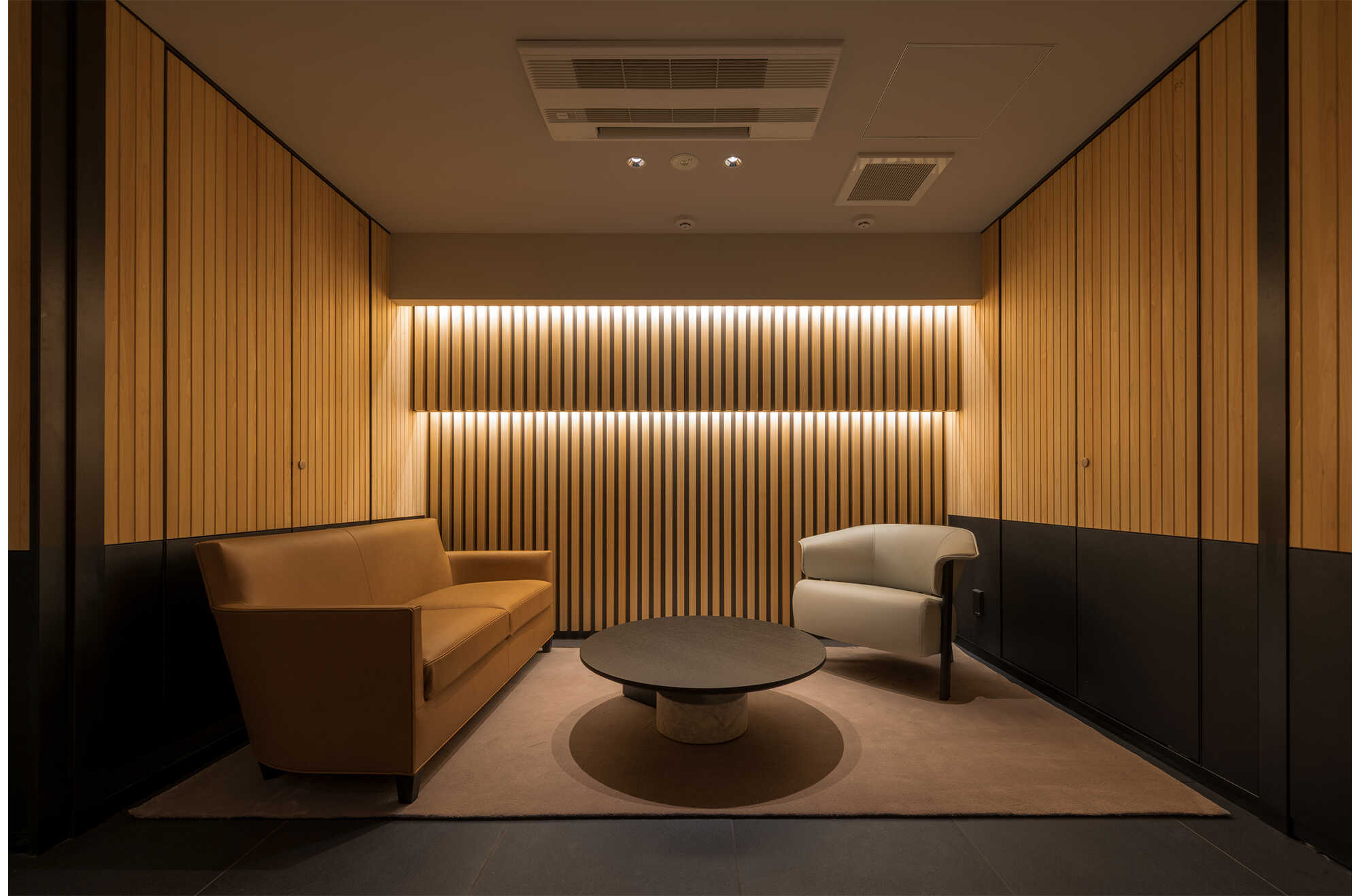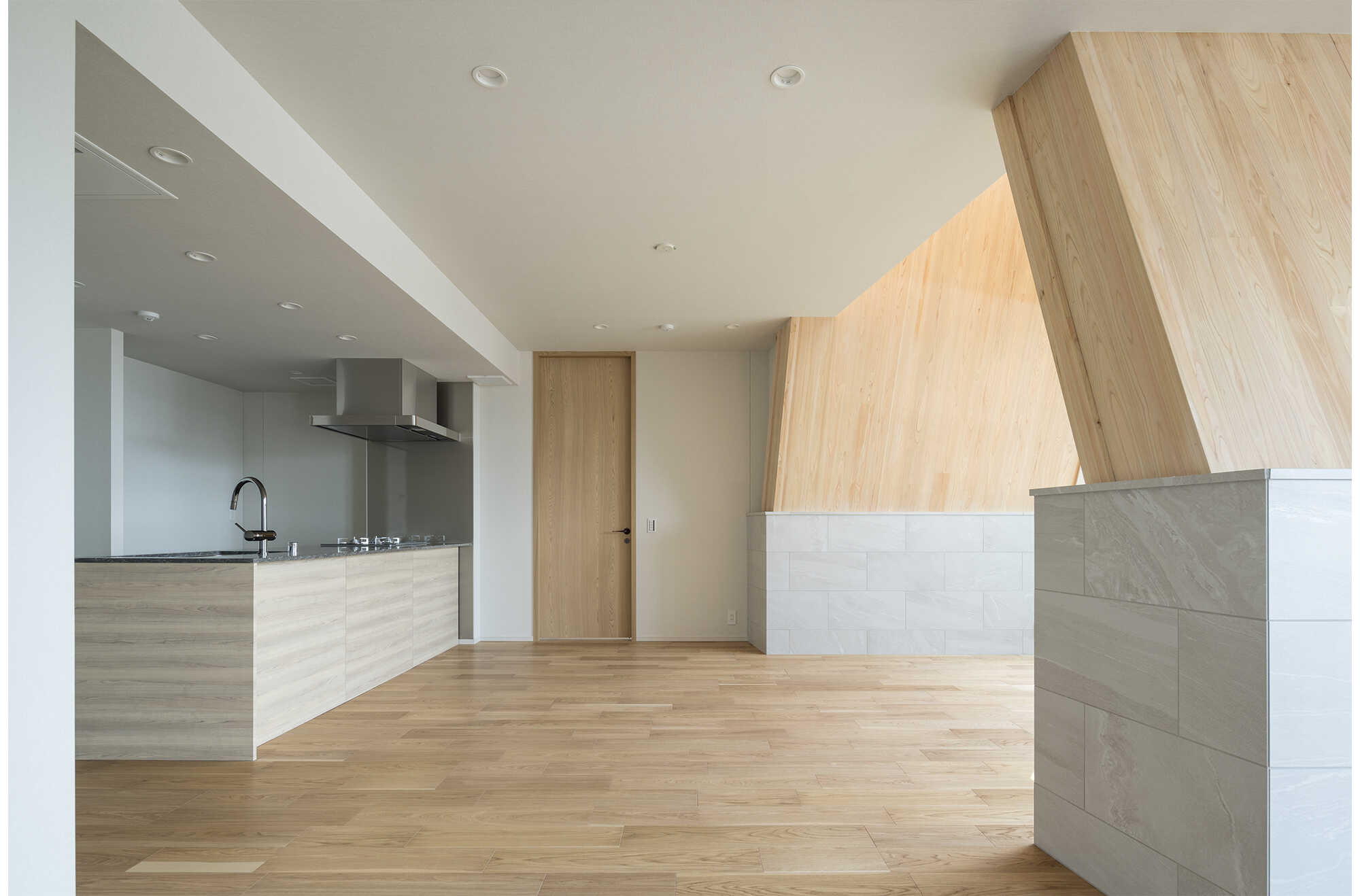 最上階のCLTを利用した住戸では、意匠性に配慮して見た目上の設備が極力少なくなるような設備納まりとしました。演出照明等によりCLTの意匠性を引き立てる設備計画としました。