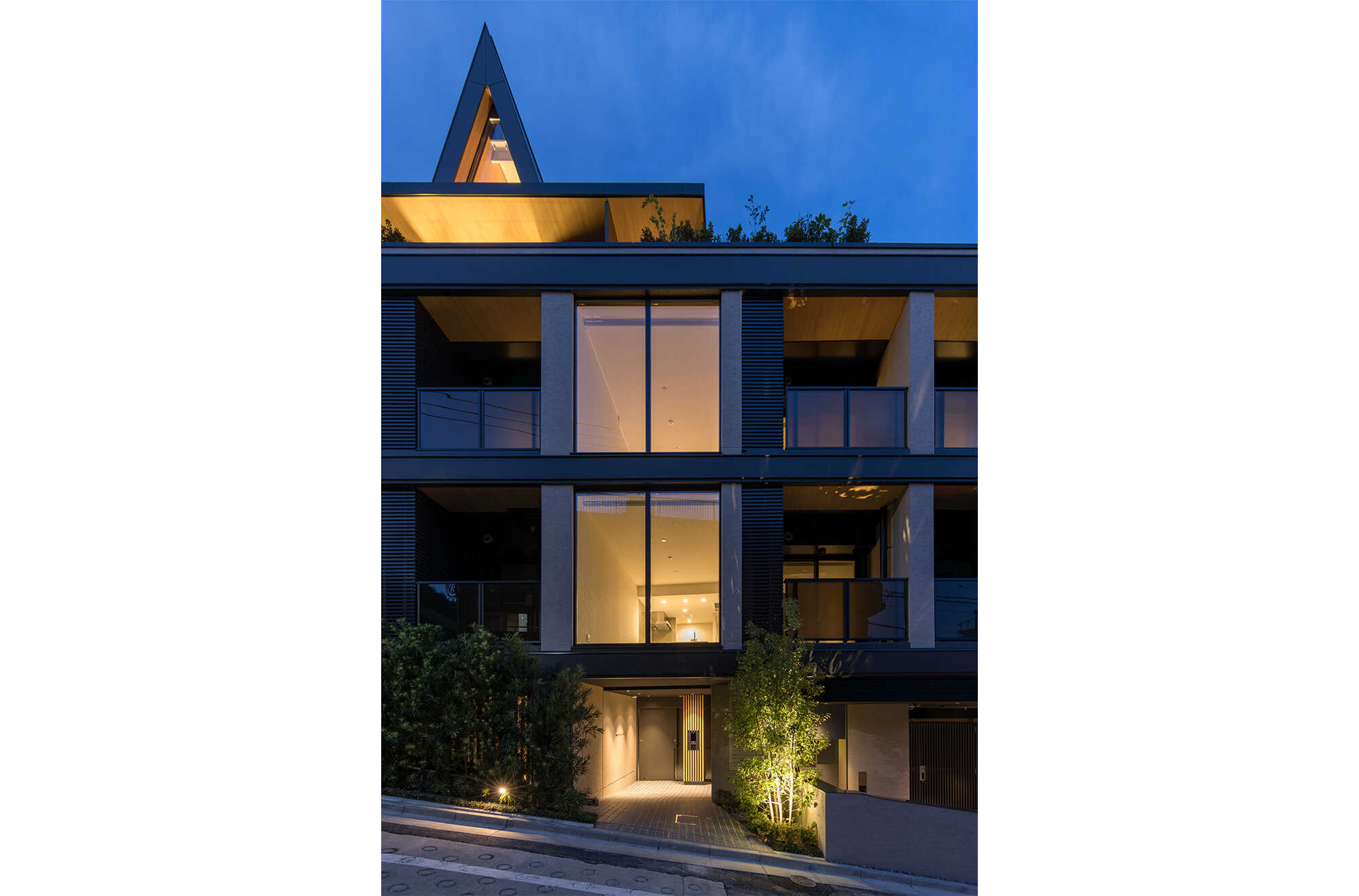 急傾斜の敷地に対して、外観は対比的にスラブや庇の水平ラインを強調させ、その上に構造としても機能する三角屋根をデザインしました。特徴的な外観デザインは、街並みのアクセントとなり新たな景観を生み出しています。