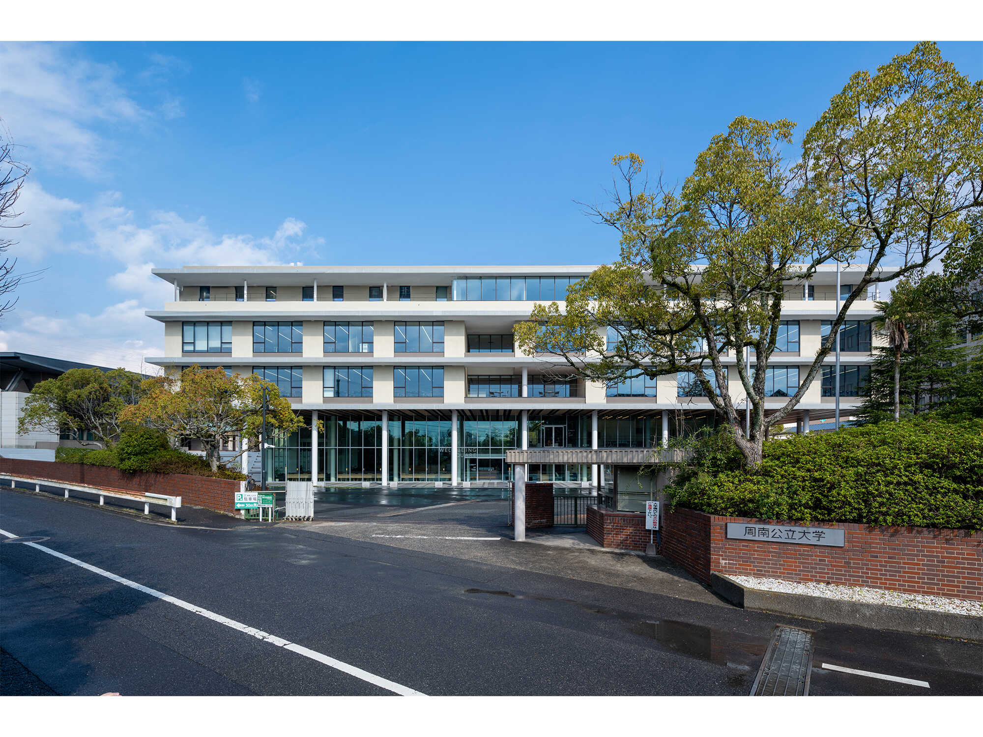 低層部を絞って四周に軒下空間を生み出し、キャンパスの見通しと回遊性を高める配置計画としました。大きく巡らせた軒の広がりが人々を迎え入れ、地域とのつながりを象徴するデザインとなっています。