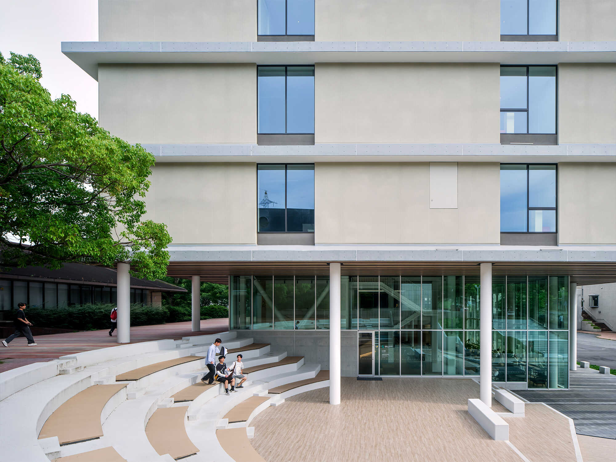 また、老朽化の著しかった野外ステージを新校舎と屋内外で連携する円形広場として再生し、キャンパスの記憶を継承しています。