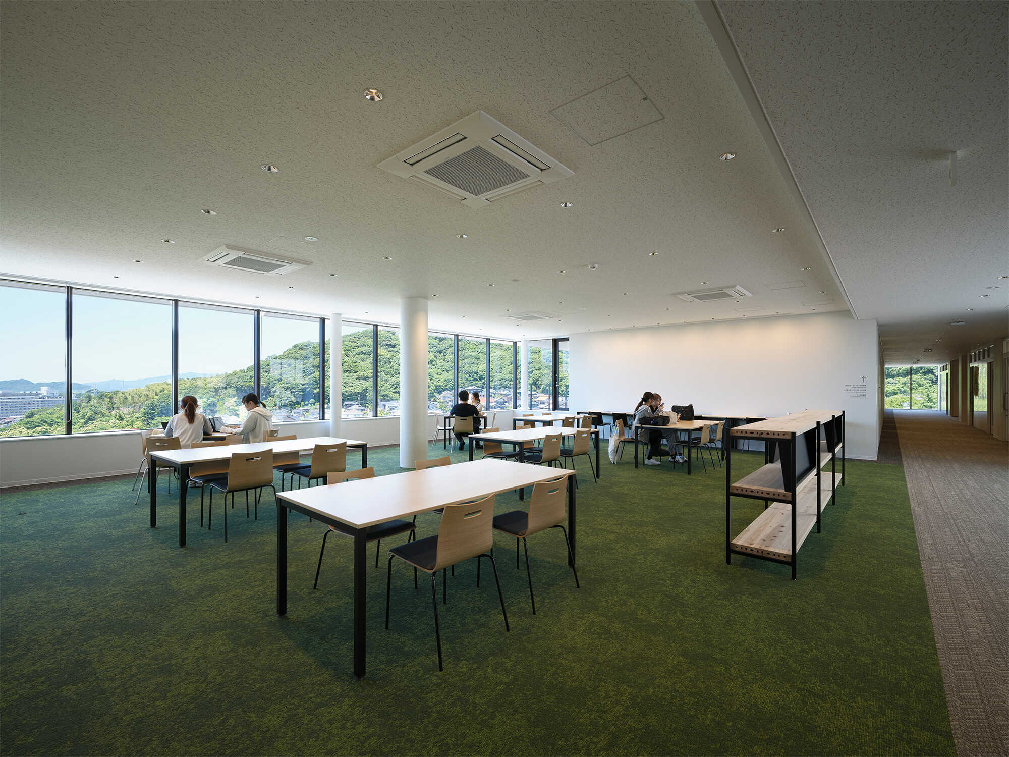 1・2階に展開する共有空間は、敷地の高低差をフロア構成に取込み、「交流」「情報」「学修」の3つのスペースを連続的に配した見通しの良い開放的な空間としました。キャンパスの四方へと繋がるこの空間はウェルビーイングスクエアと名づけられ、学内だけでなく地域の方々にも開放され、様々な人々が集い交流する居場所となっています。