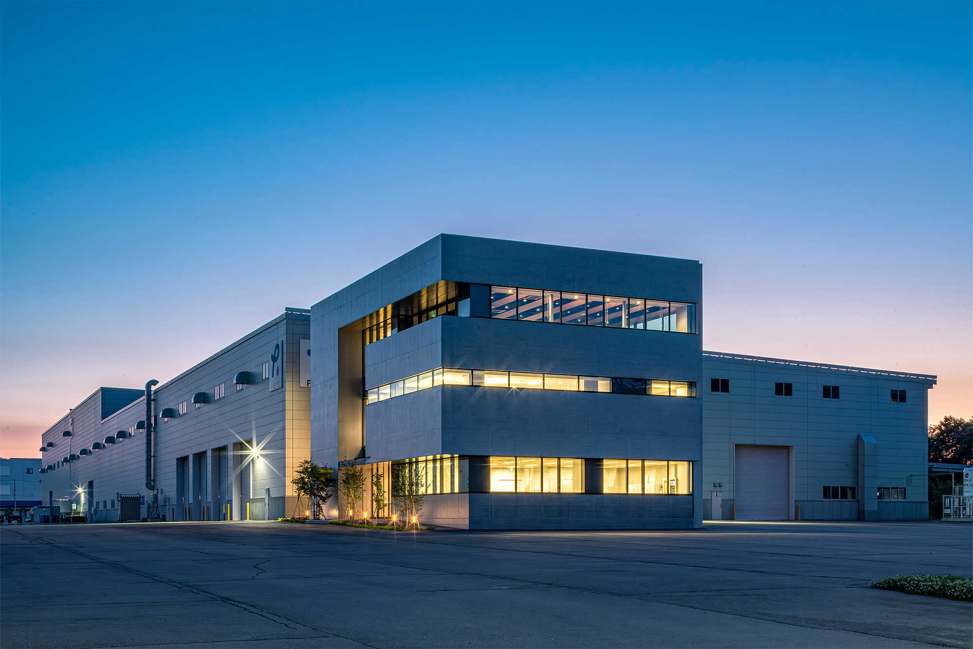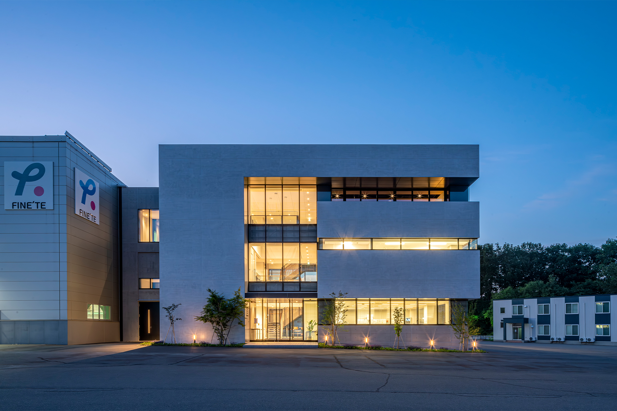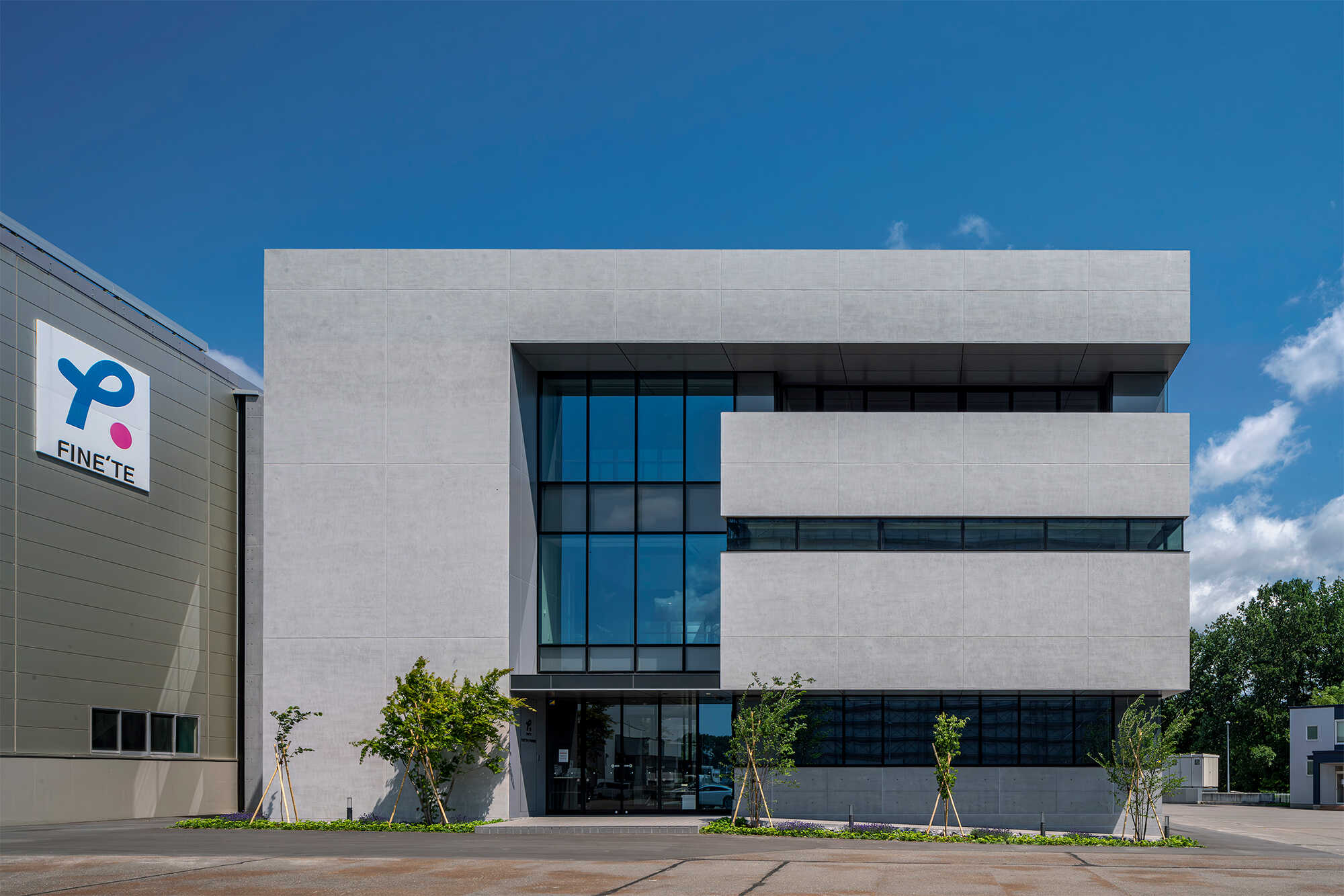 一連の既存工場とボリューム感・色彩の調和を図りながら、デザインの差別化を図り工場の新しい「顔」を創出しました。ミニマルデザインのマッシブなボリュームに「ファインテ」の「F」字型にスリットをくりぬいたファサードとしアイデンティを表明しました。