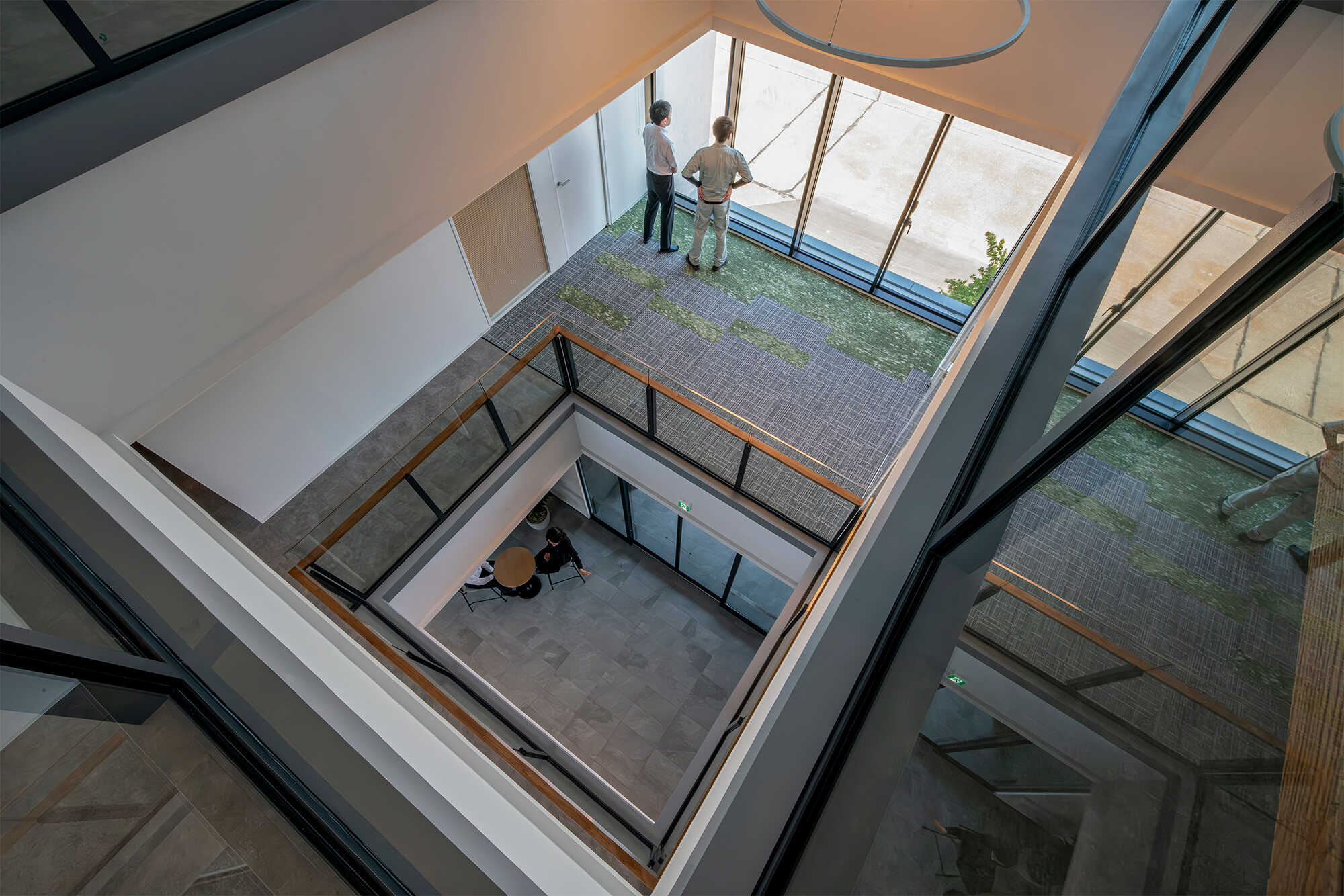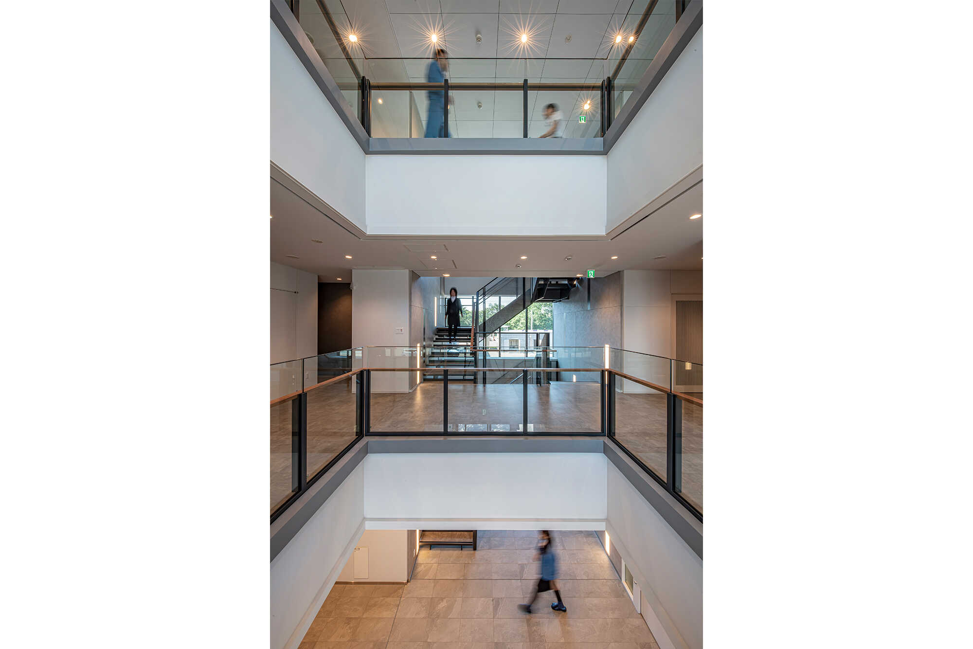 メインエントランスは、3層吹抜けとなっており、本施設の象徴的空間となっています。上下階で社員の行き来する様子が見渡すことができます。工場現場職員や事務職員など多岐にわたる社員のコミュニケーションの誘発を期待しています。
