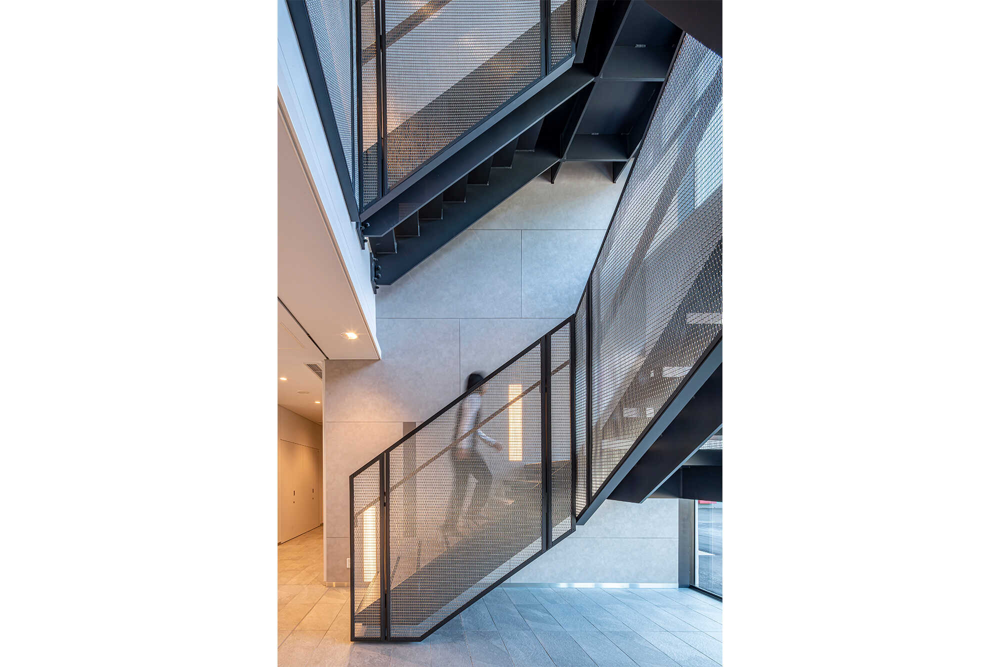 階段手摺にはステンレスメッシュを採用し、めむろ工場のステンレス工場としてのアイデンティティを表現しました。
