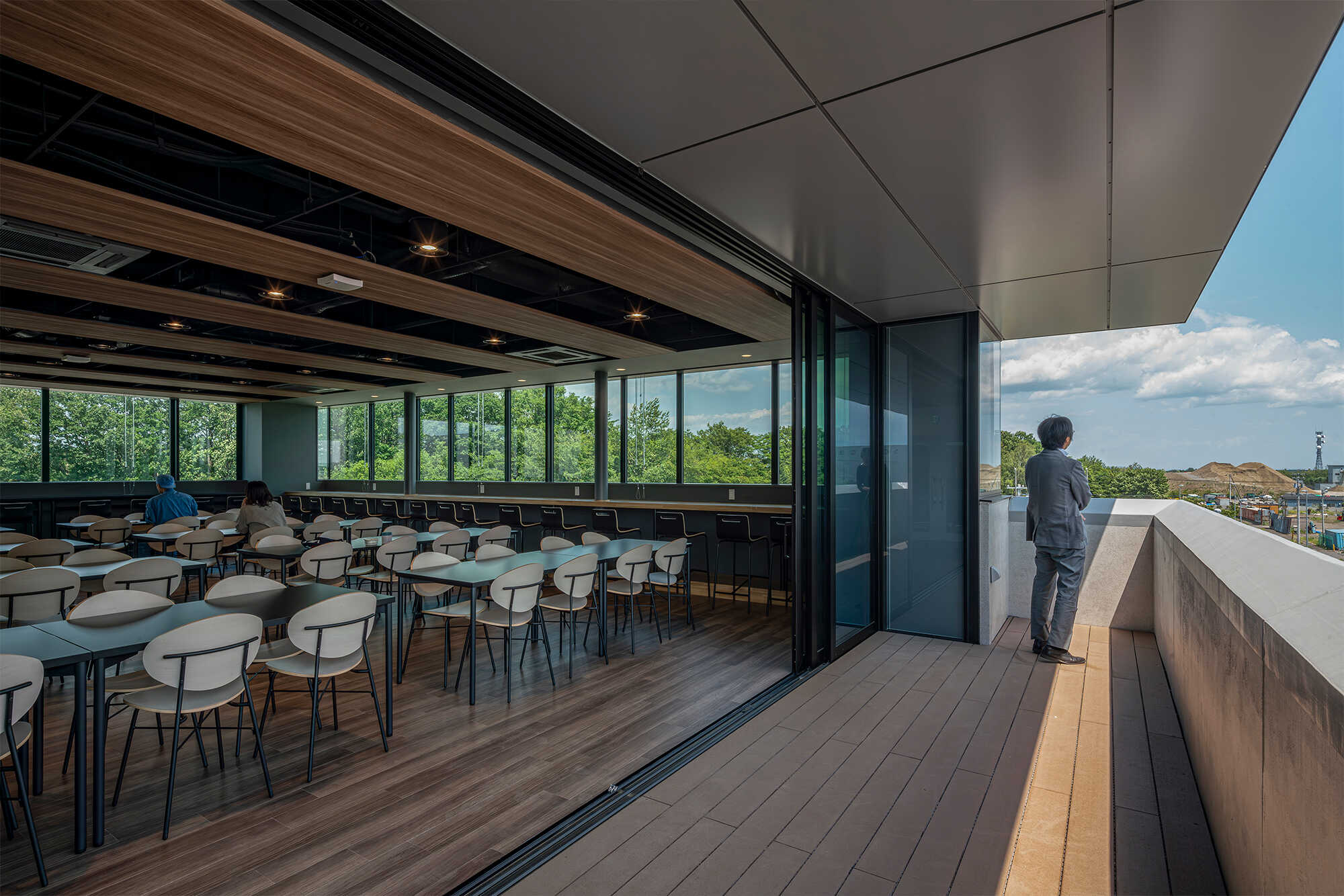 3階の多目的ホールにはフルオープンできる吐出し窓を介したバルコニーがあり、ホールと一体利用が可能です。日頃は食堂として利用されており、眼前の日高山脈や十勝平野の十勝ブルーを日々感じながらリフレッシュできる、空間となっています。