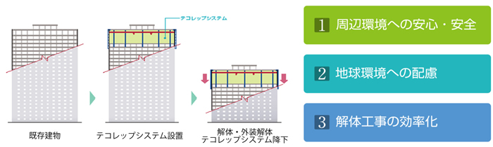 最近では、永い間「赤プリ」の愛称で親しまれた旧グランドプリンスホテル赤坂の解体工事にテコレップシステムが適用され、大きな話題となりました。