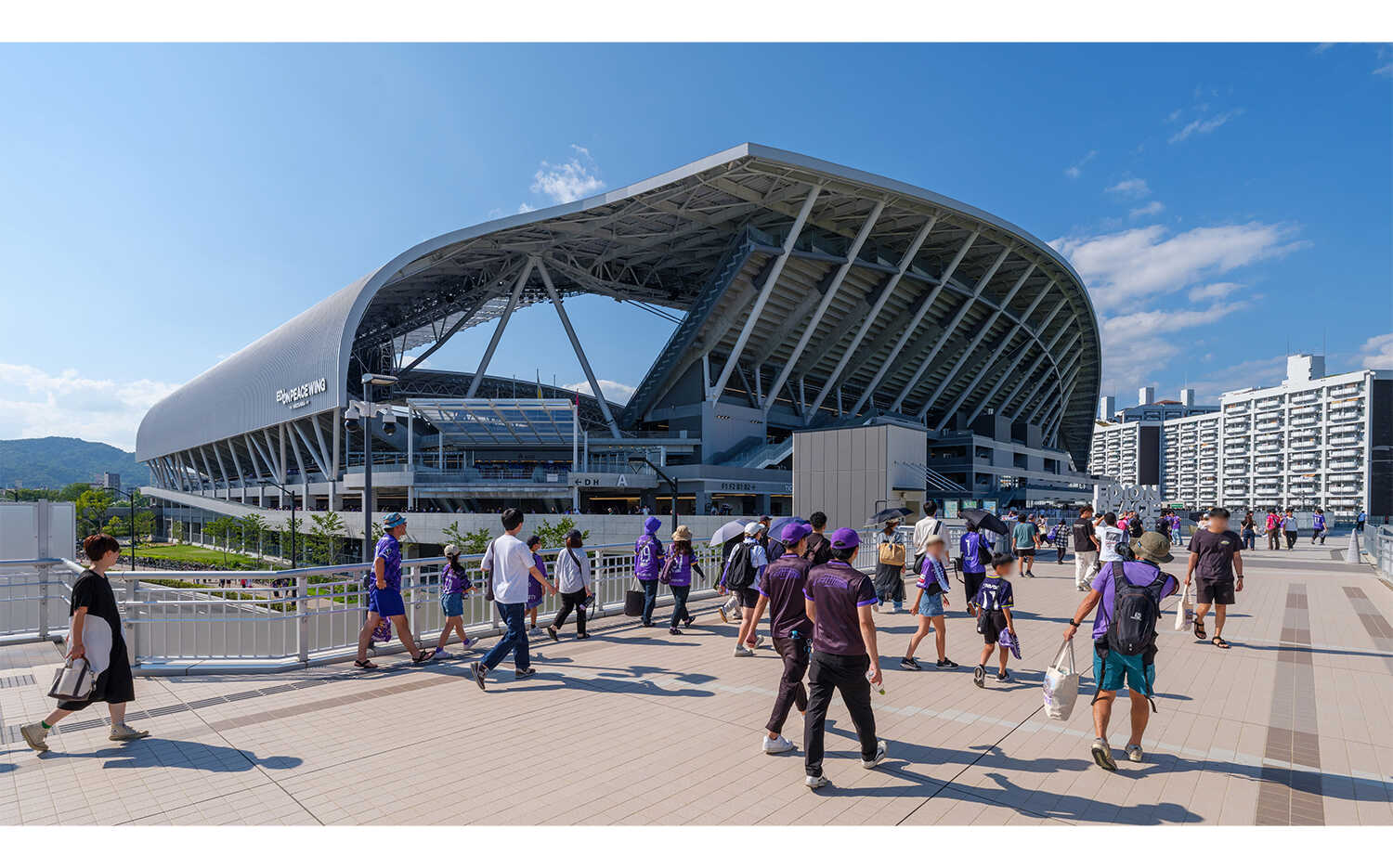 スタンドを柔らかく包み込む大屋根は、「三矢の訓」をモチーフとした矢を放つ弓のような張弦梁構造により、国際平和文化都市広島の新しいシンボルとして「平和の翼」を造形化しています。大きくまちに開いた南側の両コーナーからは、スタジアム内部の活気が隣接する芝生ひろば、そしてまちへと広がっていきます。