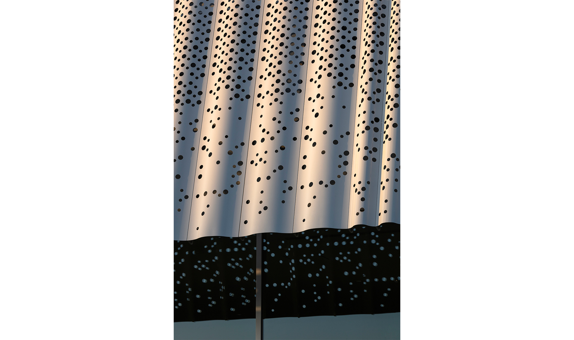 琵琶湖周辺で長く愛用されてきた葦簀(よしず)をモチーフに、強い陽射しを遮断しながら心地よく風を通す機能を持たせた「美」を象徴する環境装置「YOSHIZU SKIN」が木漏れ日空間を創出しています。