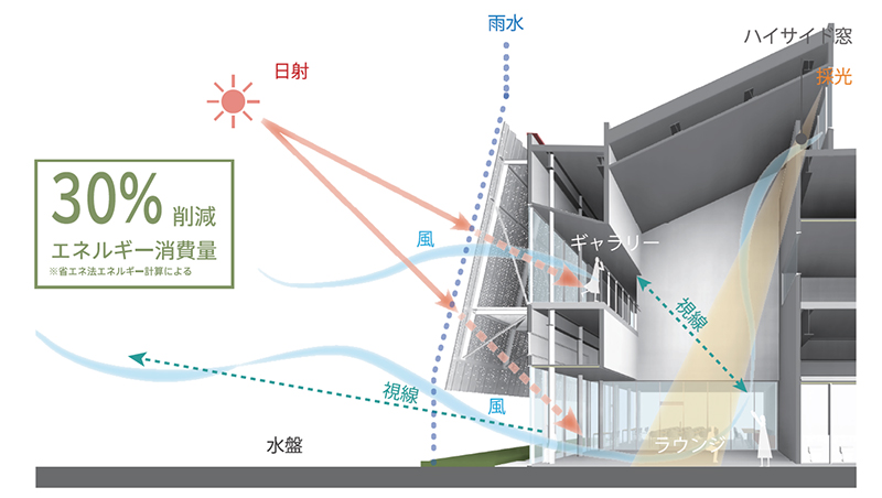 葦簀(よしず)をモチーフにした「YOSHIZU SKIN」は、強い陽射しを遮断しながら風を通し、心地のいい木漏れ日空間を創出しつつ、環境装置として機能し、建物全体として30%のエネルギー消費量の削減を実現しました。