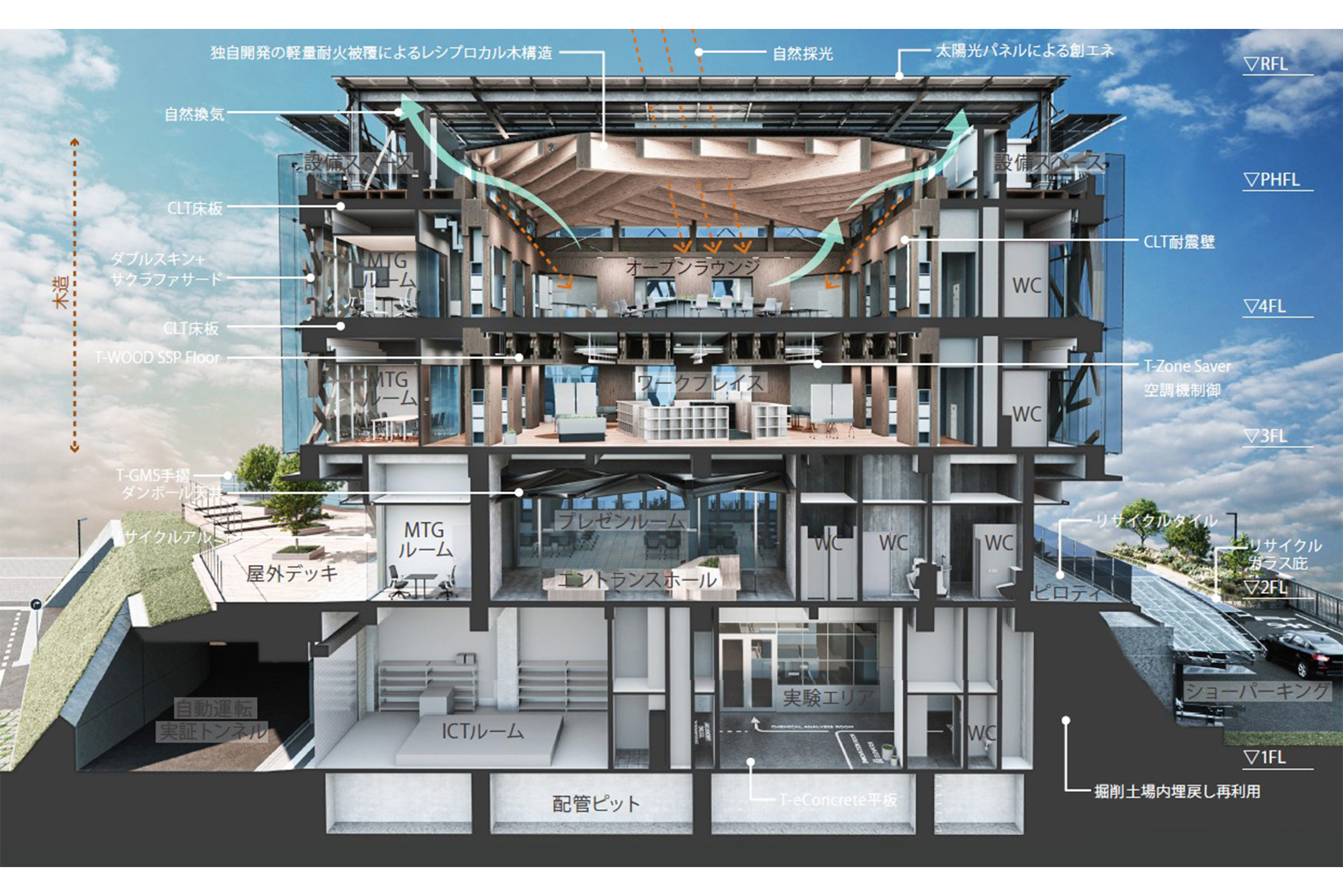 4階建ての建物の上層2層を木造とし、CO2排出量をゼロまたはネガティブにする環境配慮コンクリート「T-eConcrete® ※2/Carbon-Recycle」や、解体建物から回収した鉄骨を再生した鋼材「T-ニアゼロスチール」を採用しています。