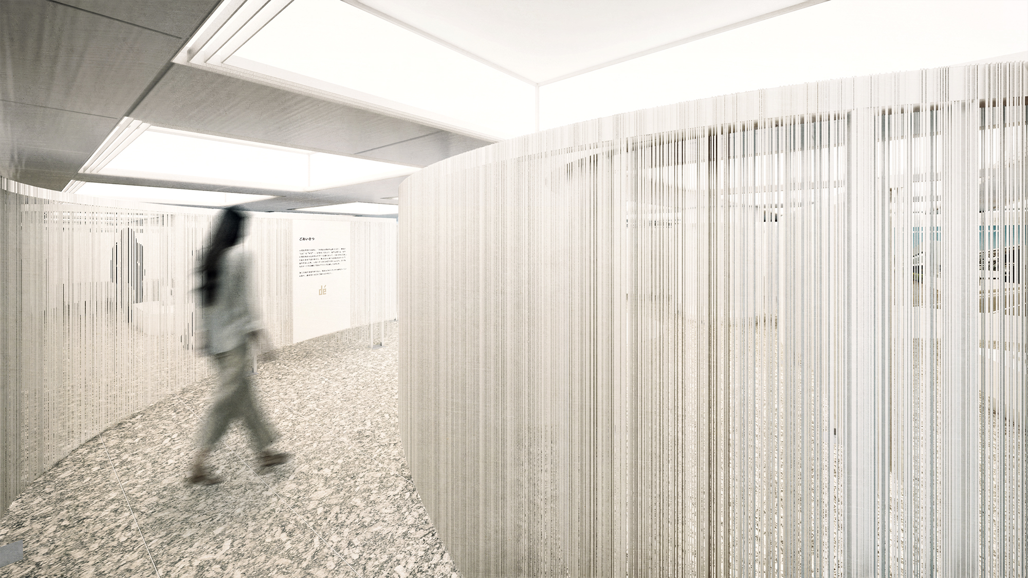 設計行為という「まえ」と「あと」を繋ぐ線=「糸」によって 展示空間を構成しました。 糸のヴェールが内外をやさしく区切り、新宿駅の中にひとつの包まれた空間を生み出します。