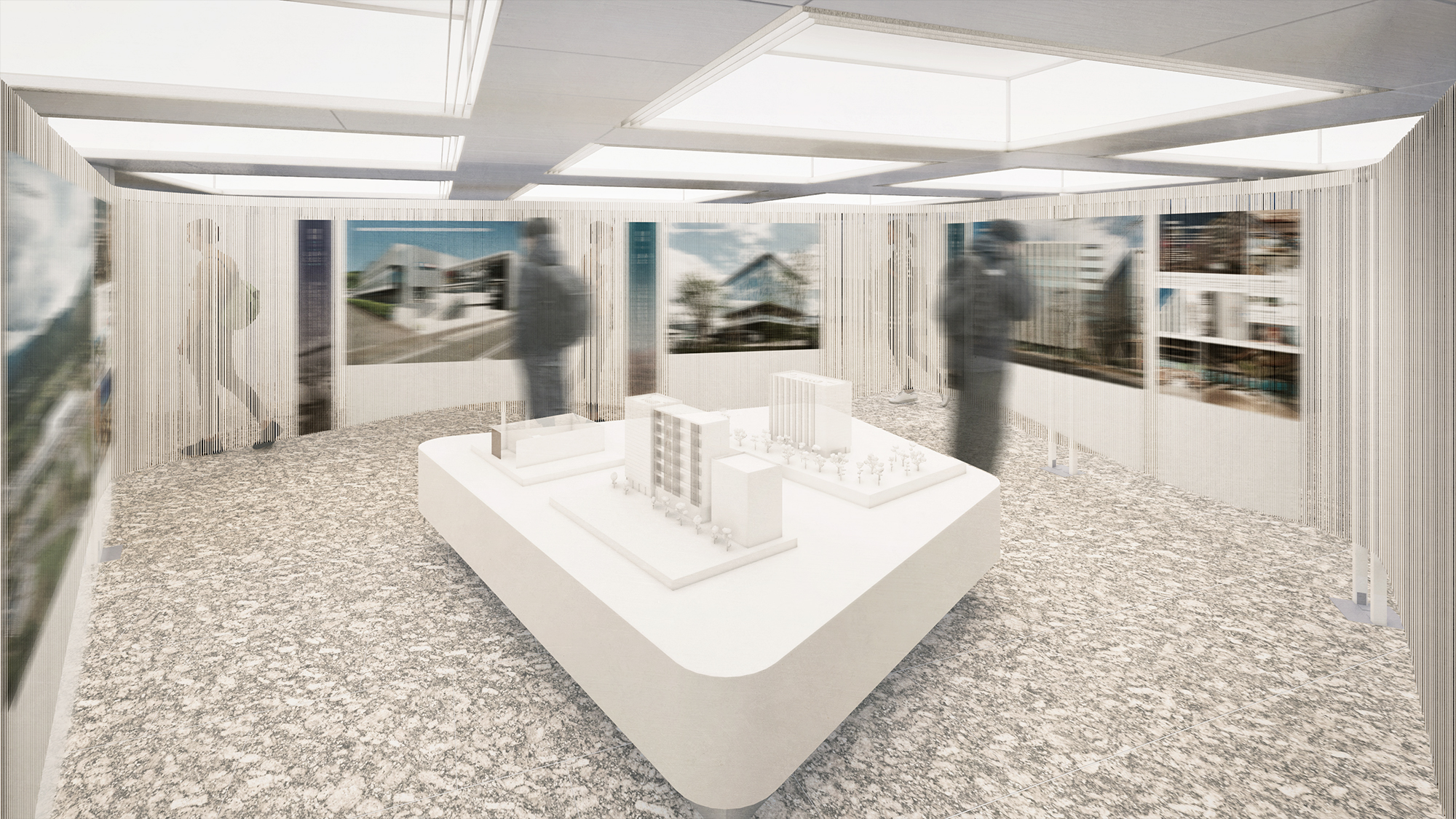 糸の隙間からは内部の様子が微かに透けて見え、駅を行き交う人々の興味を展示空間へと誘います。 外界からやさしく遮断された内部空間は、いっときの喧騒から離れ作品へと没入する時間を生み出します。