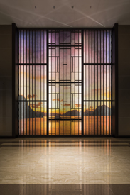 また、ハノイの立地から、ベトナムを代表する世界遺産のハロン湾の風景をモチーフにした大型ガラスモザイクに間接照明の光を組み合わせ、光の壁で利用者を温かく象徴的に出迎えています。