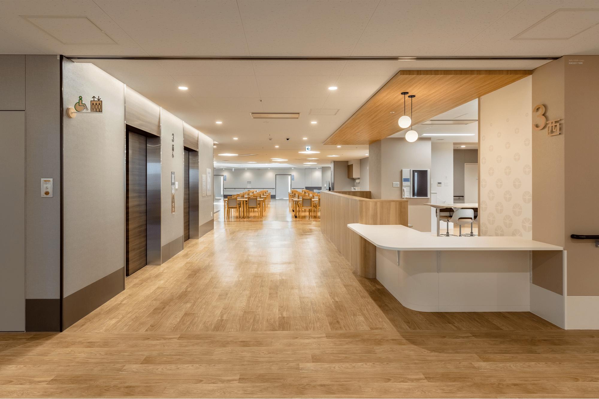 また、屋根の一部を鉄骨化することで、ナースステーション・食堂などに柱が出ないようにして、開放的な空間と見晴らしのよさを確保しました。